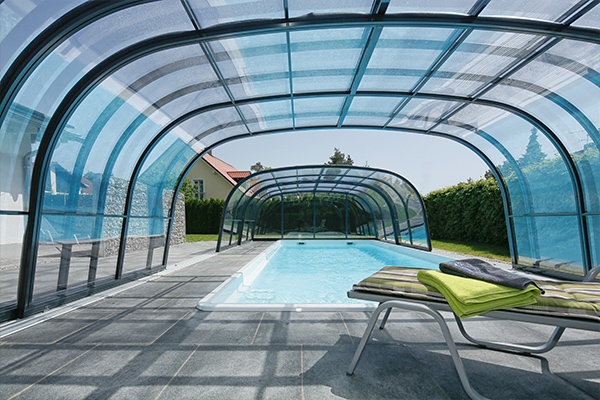 Eine Poolüberdachung reduziert den Wärmeverlust erheblich und kann in Kombination mit einer Heizung die Betriebskosten senken.